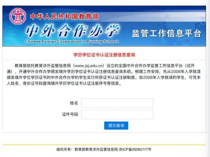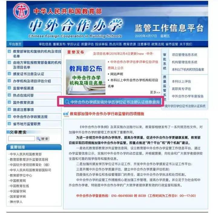 1.打开教育部涉外监管网,点击「中外合作办学颁发境外学历学位注册认证信息查询」 网址:http://www.crs.jsj.edu.cn/