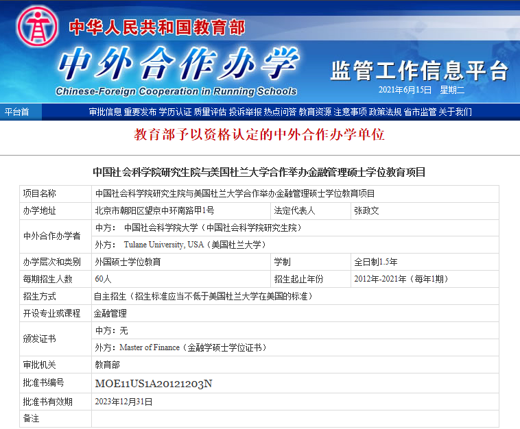 中国社科院与美国杜兰大学金融管理硕士----国家批准办学、中留服可认证