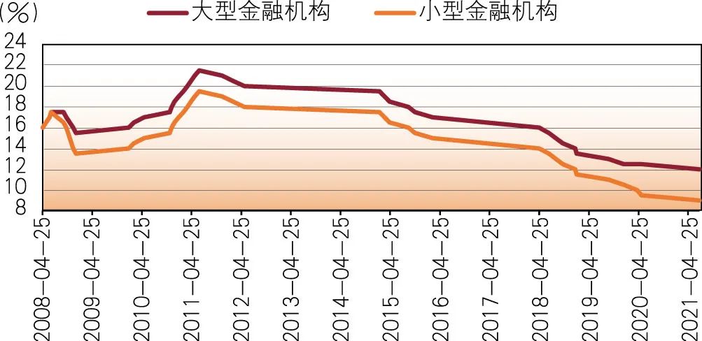 图1 2008~2021年我国金融机构法定存款准备金比率的调整