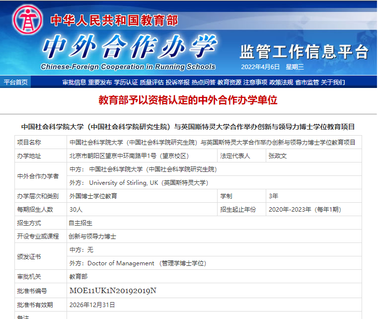 创新与领导力博士学位教育项目(DOCTOR OF MANAGEMENT 简称“DMAN”)是中国社会科学院大学(中国社会科学院研究生院)第一个博士层次的中外合作办学项目。依托中国社科院及斯特灵大学丰富的学术资源,DMAN项目通过开展多维度、跨学科的理论及实践研究,培养具备国际视野,具备一定研究能力,在面对国际商业环境中出现的问题时能够提出创新见解等能力的高级专业人才。