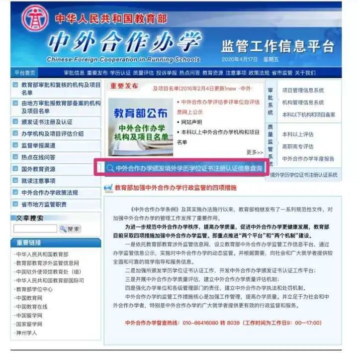 1. 打开教育部涉外监管网,点击「中外合作办学颁发境外学历学位注册认证信息查询」 网址:http://www.crs.jsj.edu.cn/