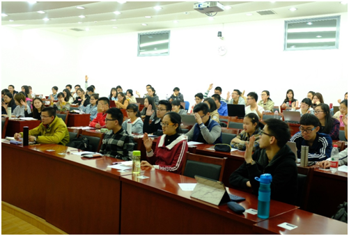 紧接着,吴老师从三个方面为我们介绍表达艺术:声音中的艺术、吐字中的艺术、创作中的艺术。讲座过程中,吴老师幽默风趣、热情投入而极具感染力的讲授方式给同学留下了深刻印象,博得了在场学生的阵阵欢笑和掌声。其间,同学们热情高涨,积极举手发言,参与到吴老师准备的小活动中,现场氛围十分活跃。讲座将要结束时,全体观众起立,运用吴老师讲授的知识技巧,怀着真挚的情感,一起诵读余光中先生的《乡愁》,声音洪亮,富有深情。最后,吴老师与台下同学就讲座相关问题进行了深入交流,讲座圆满落幕。