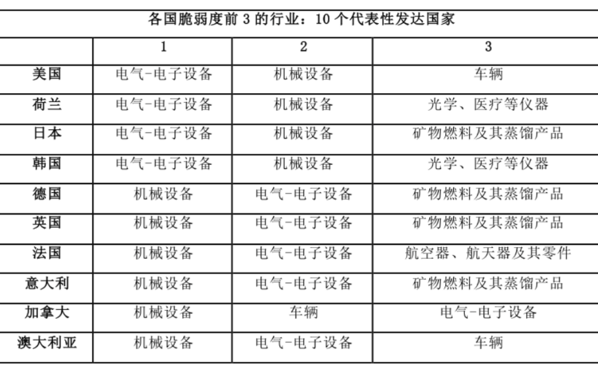 第一,各国脆弱性最高的行业往往都是两个行业——电子电气设备、机械设备。这两个行业本身的特点就是集成度较高,分工程度较高,供应链都比较长。