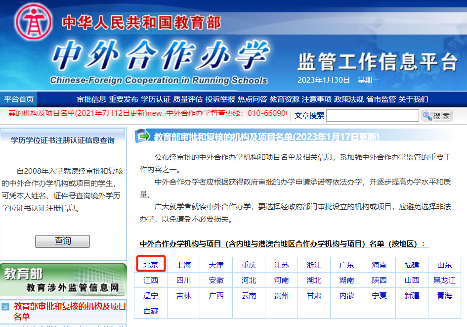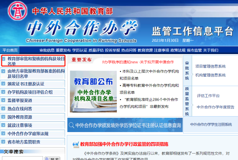 1. 打开教育部涉外监管网,点击「中外合作办学颁发境外学历学位注册认证信息查询」 网址:http://www.crs.jsj.edu.cn/