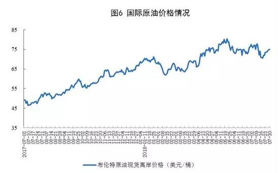 原油价格持稳盘整。截止7月底,布伦特原油现货离岸价格为74.99美元/桶,比6月底回落2.45美元/桶,但稳定在70美元/桶以上。