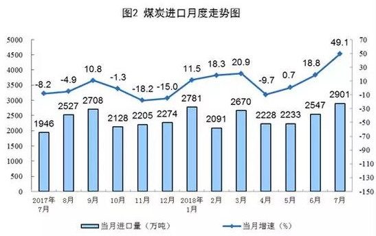 7月份,煤炭进口2901万吨,为2014年1月以来最高,同比增长49.1%,比上月增加354万吨。1-7月份,煤炭进口1.7亿吨,同比增长15.0%。