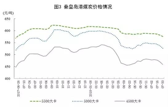 煤炭价格呈现平稳回落态势。截至7月30日,秦皇岛5500大卡煤炭综合交易价格为576元/吨,比6月底下降12元;5000大卡煤炭价格为527元/吨,比6月底下降20元;4500大卡煤炭价格为459元/吨,比6月底下降21元。