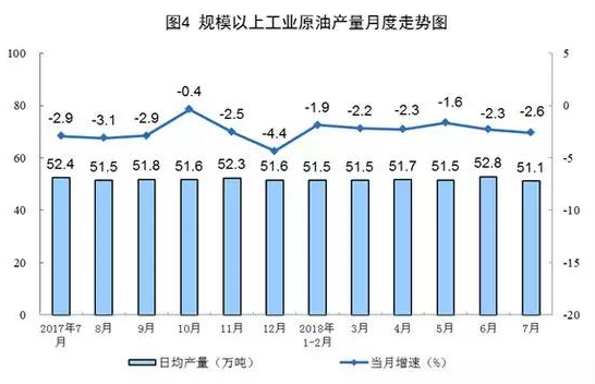 7月份,原油生产1585万吨,同比下降2.6%,降幅比上月扩大0.3个百分点;日均产量51.1万吨,环比减少1.7万。1-7月份,原油产量10995万吨,同比下降2.1%。