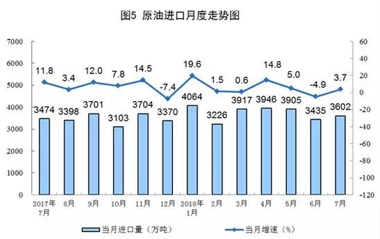 原油进口增速由负转正。7月份原油进口量同比增长3.7%,上月为下降4.9%。1-7月份,进口原油26083万吨,同比增长5.6%。