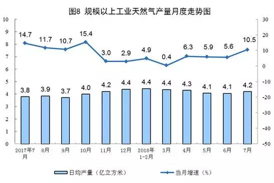 7月份,天然气产量130亿立方米,同比增长10.5%,增速比上月加快4.9个百分点;日均生产4.2亿立方米,环比增加0.1亿立方米。1-7月份,天然气产量905亿立方米,同比增长5.5%。