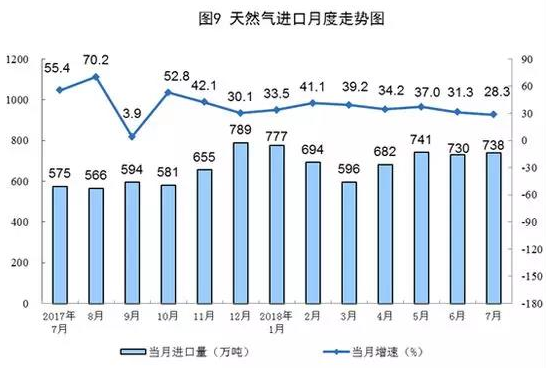天然气进口持续高速增长。7月份,天然气进口量同比增长28.3%,增速比上月放缓3个百分点;进口天然气738万吨,比上月增加8万吨。1-7月份,进口天然气4943万吨,同比增长34.3%。
