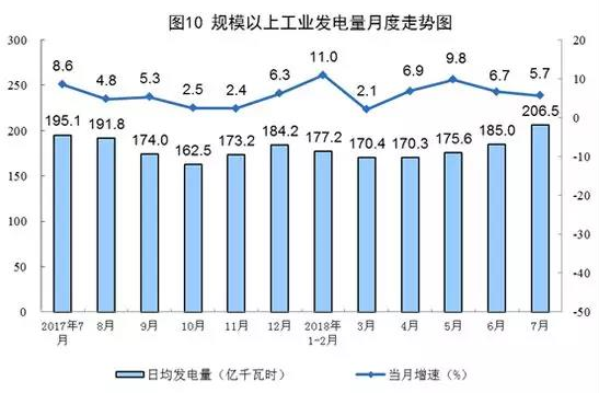 7月份,规模以上工业原煤生产增速回落,煤炭进口大幅增加;原油生产有所下降,进口增速由负转正,原油加工量增长加快;天然气生产加快,进口持续高速增长;电力生产继续较快增长。