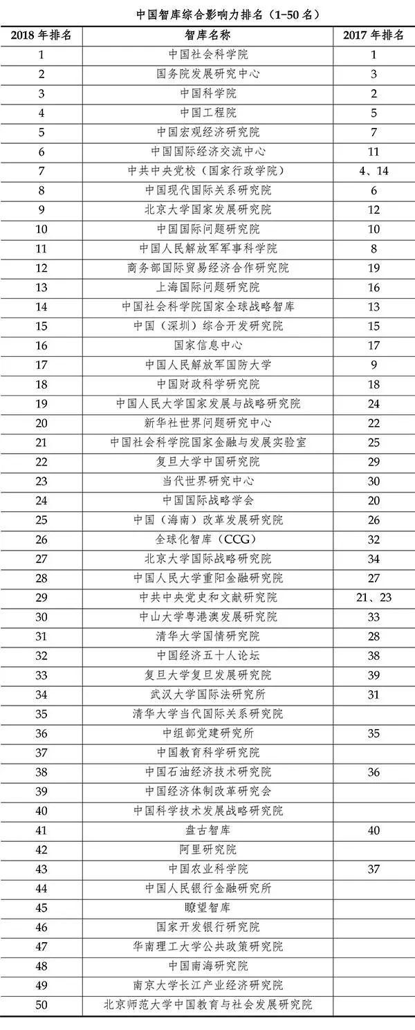 《2018中国智库报告——影响力排名与政策建议》发布,2018年中国智库综合影响力50强出炉。中国社会科学院、国务院发展研究中心、中国科学院、中国工程院、中国宏观经济研究院、 中国国际经济交流中心、中共中央党校(国家行政学院)、中国现代国际关系研究院、北京大学国家发展研究院、中国国际问题研究院等智库机构位列前十。