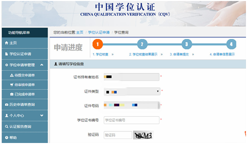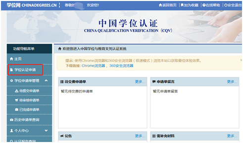 四、进入学位网后,点击页面左侧学位认证申请,如下图: