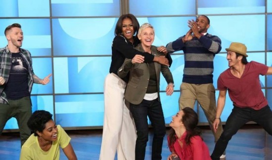 (会场响起Lady Gaga的《Just dance》,ellen在演讲台上摇摆起来,就像她在1000多期ellen show中,每期必做的一样,一路跳舞到人群中去。那一刻,觉得很温暖呢。