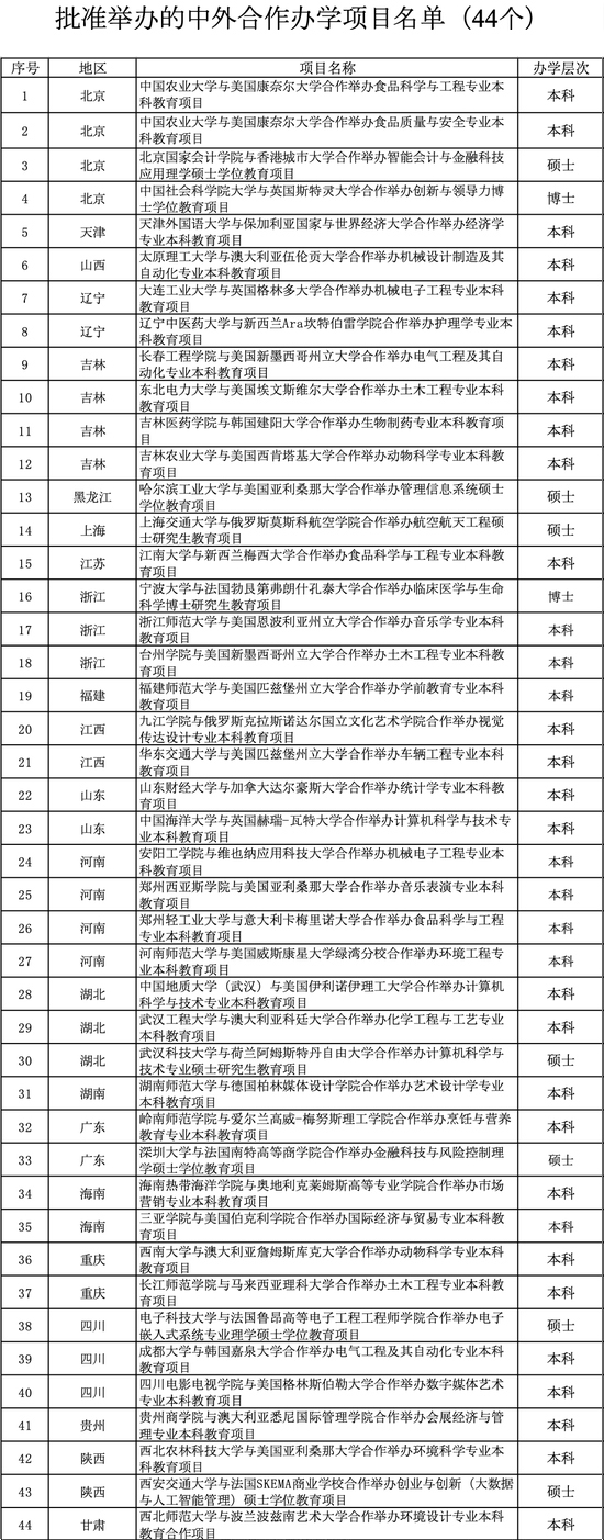 从层次上看。获批的44个项目中,博士层次仅有2个(其中就包含中国社会科学院大学与英国斯特灵大学合作举办创新与领导力博士学位教育项目),硕士层次7个,本科层次31个。