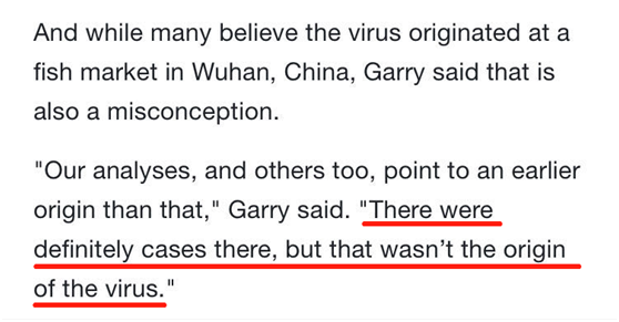 加里在采访中表示,尽管许多人认为该病毒起源于中国武汉的一个海鲜市场,但这是一个错误观点。加里说: “我们的分析以及其他一些分析都指向了比那更早的起源。武汉那里肯定有一些病例,但绝不是该病毒的源头。”