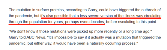 加里称,表面蛋白的突变可能是触发这次新冠病毒大流行的原因,但是在积累到目前情况之前,这种病毒的较弱版本已经在人群中传播了数年,甚至几十年。