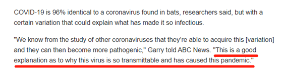 此外,加里在专访中表示,“我们从对其他冠状病毒的研究中得知,病毒能够获得这种变异,然后它们会变得更具致病性。这很好地解释了为什么这种病毒如此容易传播并导致了目前的大流行。”