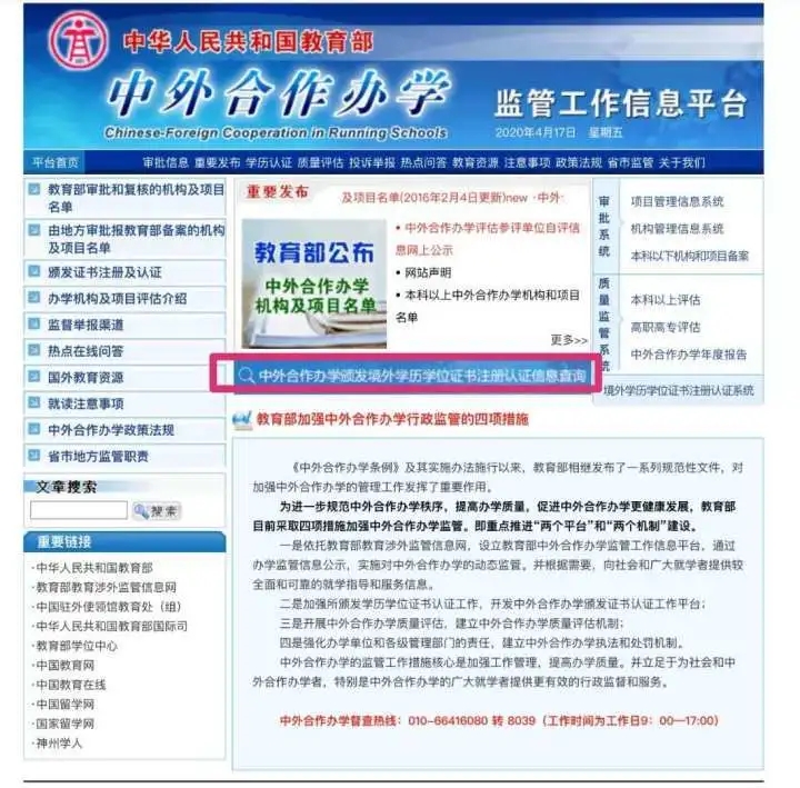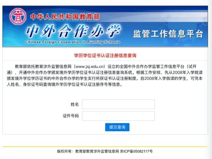 1. 打开教育部涉外监管网,点击「中外合作办学颁发境外学历学位注册认证信息查询」 网址:http://www.crs.jsj.edu.cn/