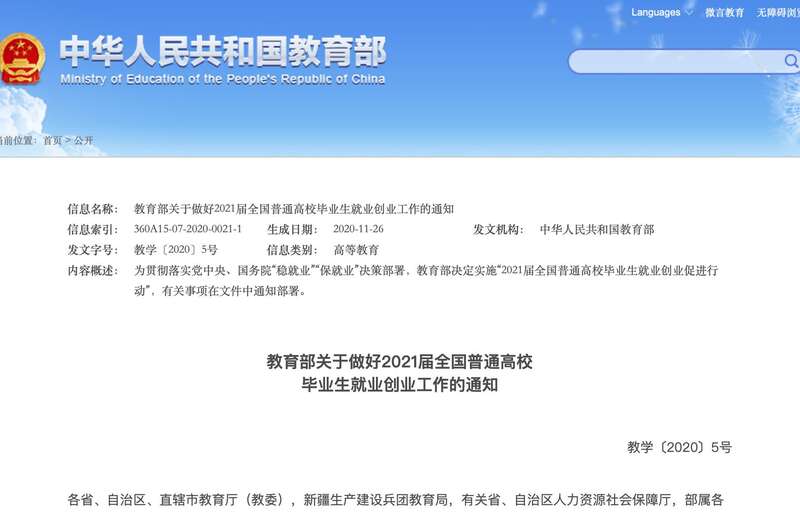 中国青年报客户端北京12月1日电(中青报·中青网记者 叶雨婷)今天记者从教育部获悉,教育部发布关于做好2021届全国普通高校毕业生就业创业工作的通知。通知指出,树立正确用人导向。推动党政机关、事业单位、国有企业带头扭转“唯名校”“唯学历”的用人导向,在招聘公告和实际操作中不得将毕业院校、国(境)外学习经历、学习方式(全日制和非全日制)作为限制性条件。