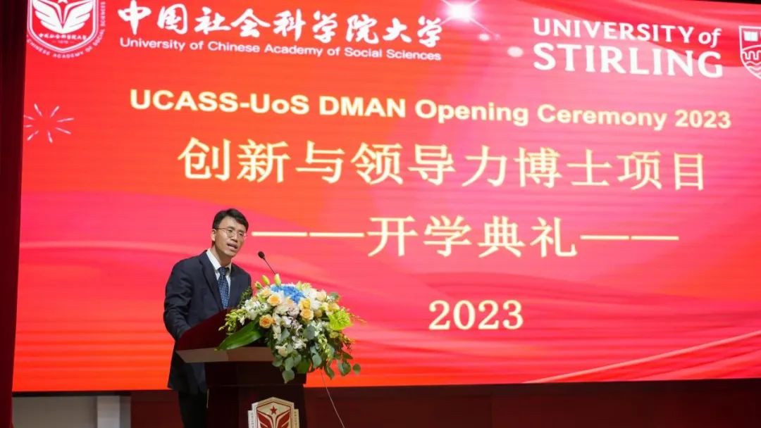 2023年9月16日上午,中国社会科学院大学—英国斯特灵大学创新与领导力博士项目2023级开学典礼在中国社会科学院大学望京校区举行。中国社会科学院大学副校长张波教授,英国斯特灵大学国际化及国际合作伙伴处执行主任Lee Zhuang,英国斯特灵大学管理学院 William Webster教授,中国社会科学院大学国际教育学院院长高海龙教授、副院长孙兆阳副教授,北京联唐教育咨询有限公司李兴元女士、王国宇先生出席。本场典礼由国际教育学院院长高海龙教授主持。