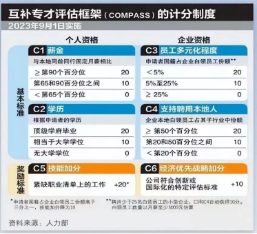 新加坡就业准证的申请门槛包括两个方面,一是本科及以上文凭(或工作经验丰富的大专文凭);二是申请者的月薪在5000新币及以上,金融服务业申请者月薪则要求5500新币及以上。不过,从2023年9月1日开始,就业准证的申请将被整合成一个系统,达到该系统的最低门槛才能被接受,该积分系统被命名为“互补专才评估框架”。积分制度如下: