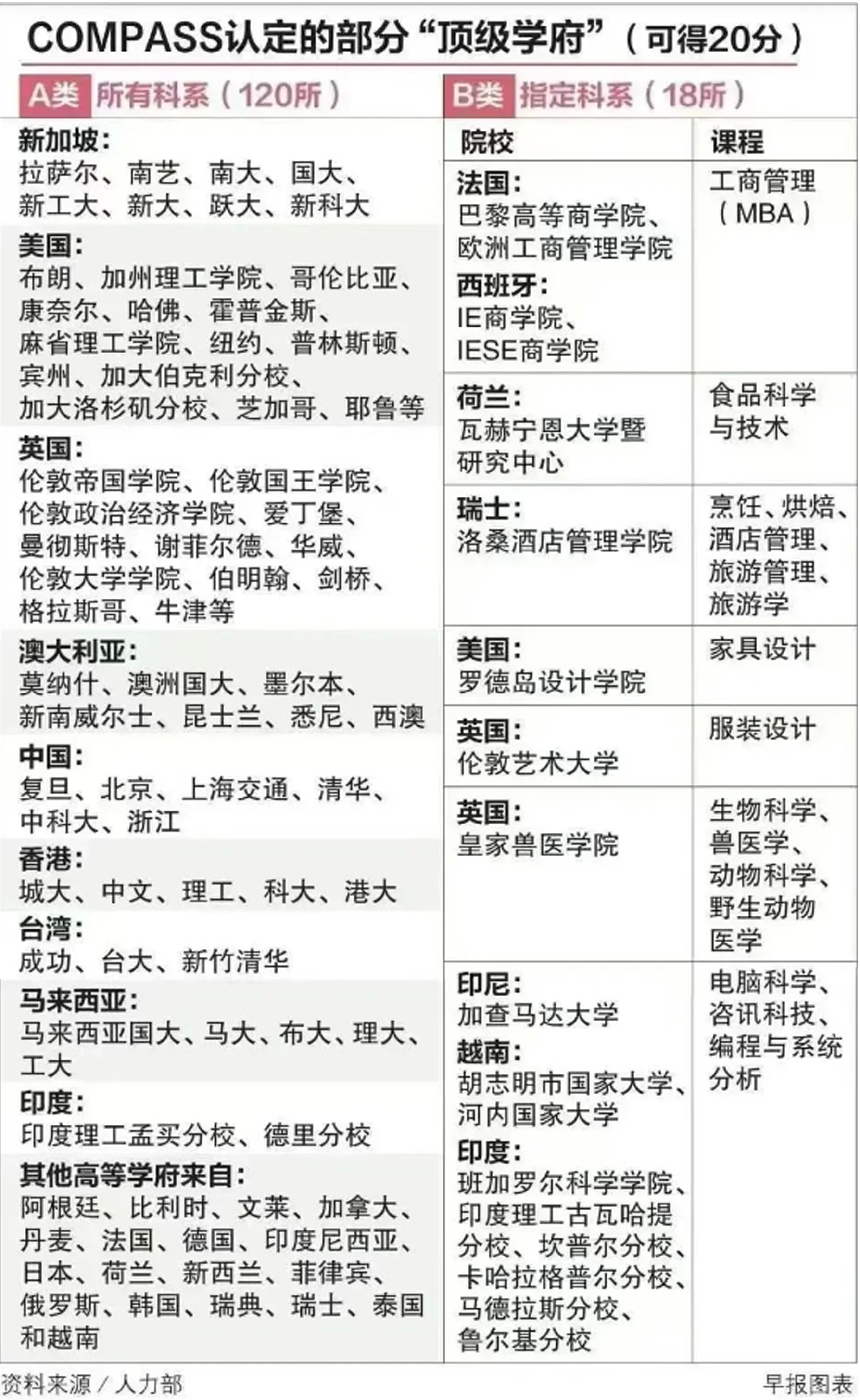 在学历方面,申请人拥有新加坡认可的顶级学府的学位,可额外加20分。其中分为A类与B类,A类所有科系都能加分,B类只有指定大学的指定科系才能加分。